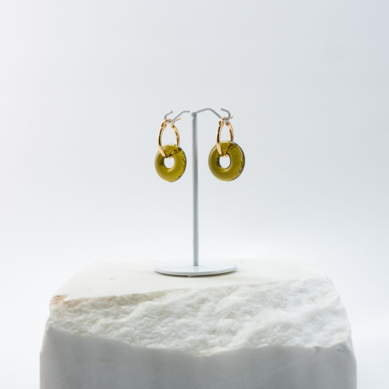 Olive green round wine bottle glass on a steel ring. All metal elements are hypoallergenic and nickel free.