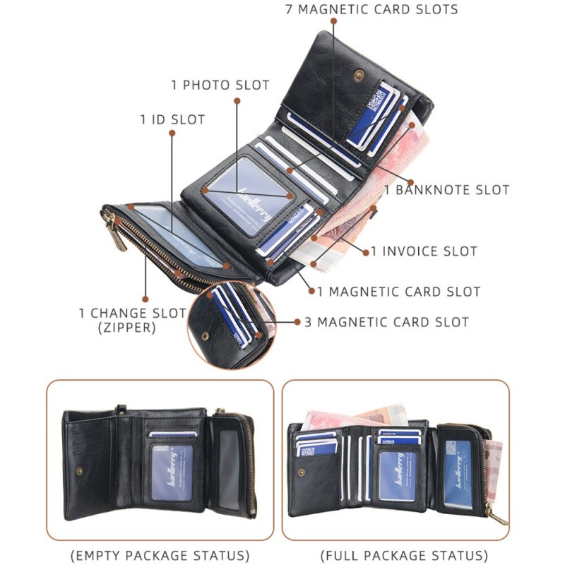 The BAELLERRY wallet is a fashionable and stylish accessory for men. The wallet is made of high-quality polyurethane (PU) leather, which is known for its durability, water resistance, and softness. The wallet originates from China and is designed to be short in length, with a height of 3cm, a width of 10cm, and a length of 12cm, making it compact and easy to carry. The wallet has a solid pattern type and features two unique decorations, chains, and sequins, giving it a stylish and fashionable appearance. The chains and sequins give the wallet a touch of elegance and sophistication, making it an excellent accessory for any occasion. The wallet features multiple compartments that are designed to help you organize your items efficiently. The compartments include an interior slot pocket, an interior zipper pocket, an interior key chain holder, an interior compartment, a zipper pouch, a coin pocket, a note compartment, a photo holder, and a card holder. These compartments provide ample space for you to store your cash, cards, coins, and other valuables. The lining of the wallet is made of high-quality polyester material, which is known for its strength and durability. The wallet's material composition is 100% PU leather, making it a cruelty-free and vegan-friendly product. The wallet has a zipper and hasp closure, which provides secure storage for your items. This closure ensures that your items are safe and secure and prevents them from falling out of the wallet. Overall, the BAELLERRY wallet is a functional and fashionable accessory that is perfect for men who value organization and style. Its high-quality materials, multiple compartments, and unique decorations make it an excellent choice for everyday use or special occasions.