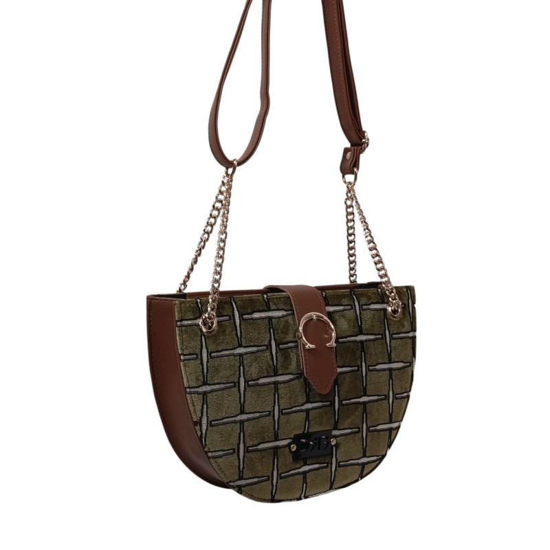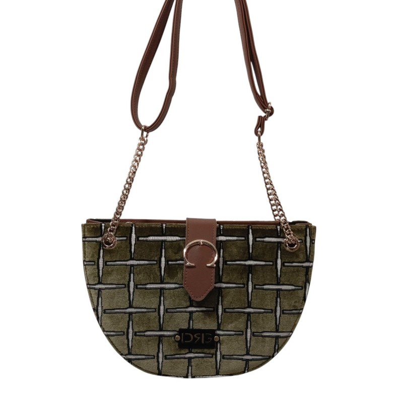 The Grid Luna shoulder bag is inspired by the geometry of the moon—semi-circular, refined, and subtly striking. Handcrafted in Greece from velvety fabric with leather lining, it features gold chain details, a minimal flap with secure zipper, and a metallic DRG logo. Measuring 24 × 30 × 9 cm, it combines minimalist elegance with practical style.
