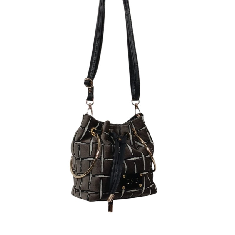 The Grid Ring is the boldest edition of the Grid series, featuring a striking bucket design, gold circular handles, and a signature geometric pattern for a blend of urban chic and evening luxury. Handcrafted in Greece from velvety fabric with leather lining, it includes a leather drawstring with black accents, a detachable adjustable shoulder strap, and a metallic DRG logo. Measuring 24 × 22 × 12 cm, it offers style, versatility, and comfort.
