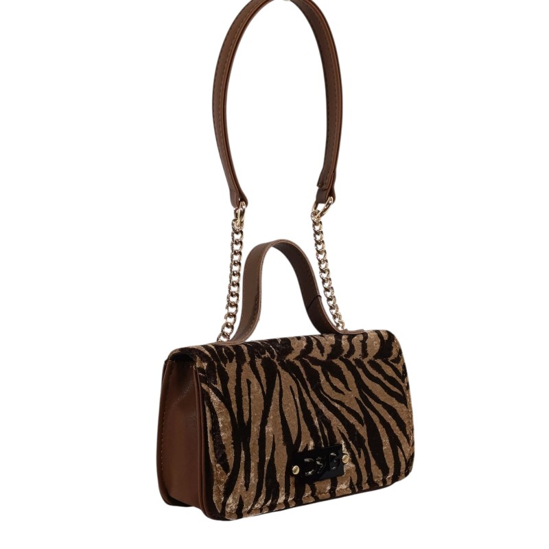 The DE RAGGI “Zebra Icon” Shoulder Bag is the epitome of Greek luxury design. Measuring 15 × 23 × 7 cm, it features a velvety zebra texture in earthy tones, a gold-tone shoulder chain, and a practical top handle for versatile styling. Handcrafted in Greece from artificial leather with a leather lining, it combines timeless elegance with high-quality materials and finishes, making it perfect for day-to-night looks while showcasing the signature DRG metal emblem.